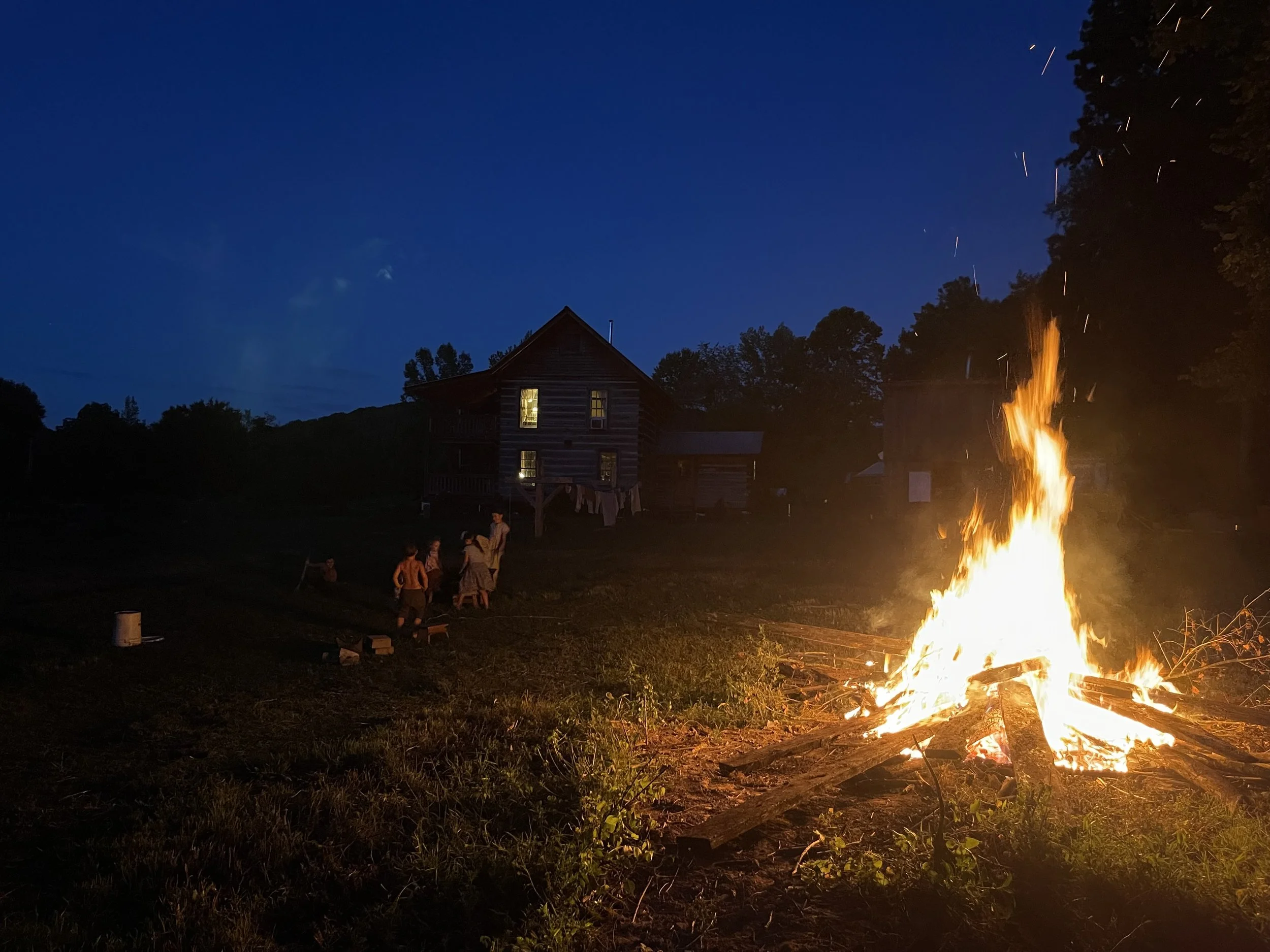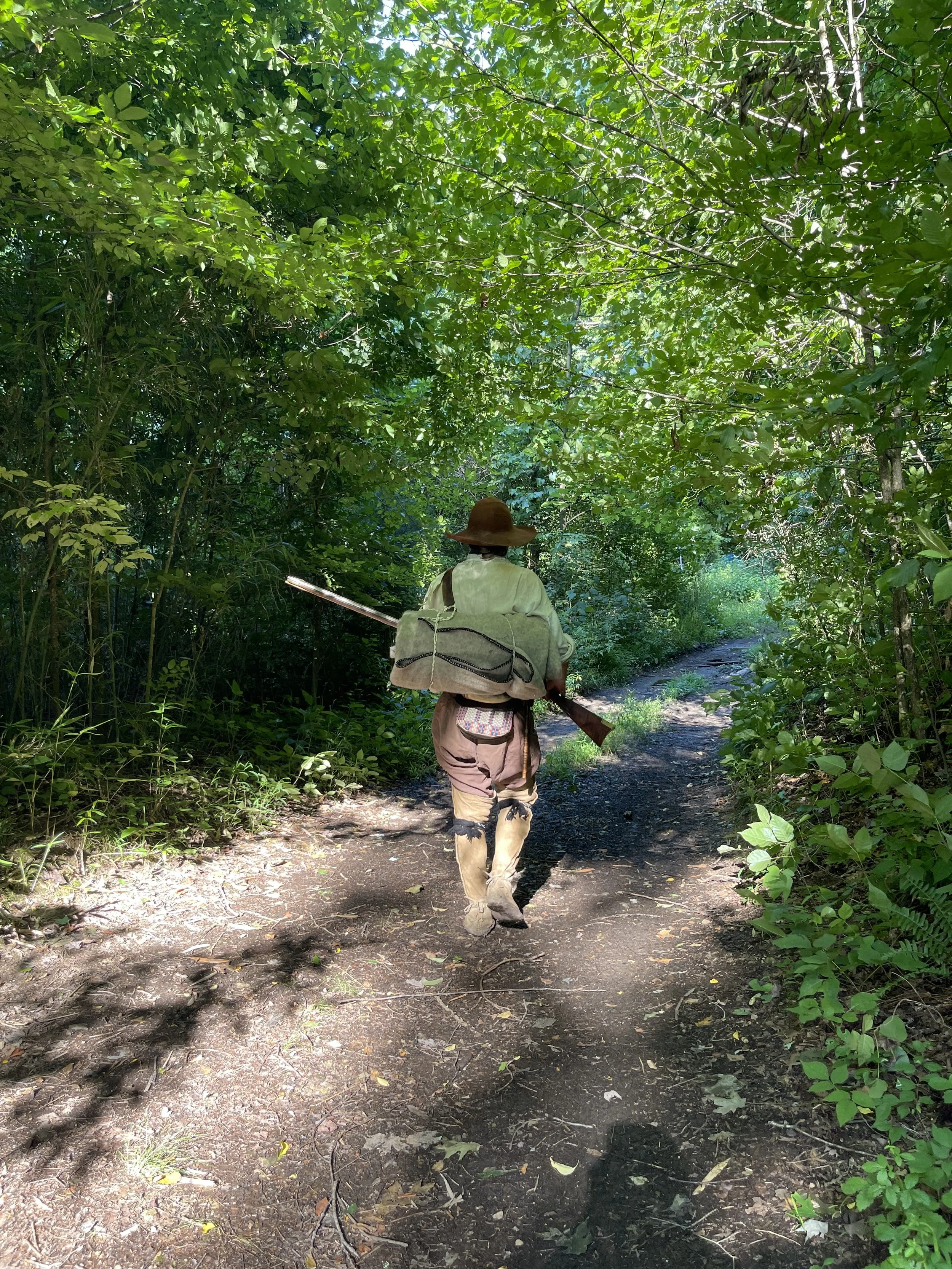 Elijah has been working on putting together a “kit” of clothing and gear appropriate to the American frontier in Cumberland settlement area during the Revolutionary War, and here he is off to the woods at the end of the day to test his kit a little by sleeping under the stars.