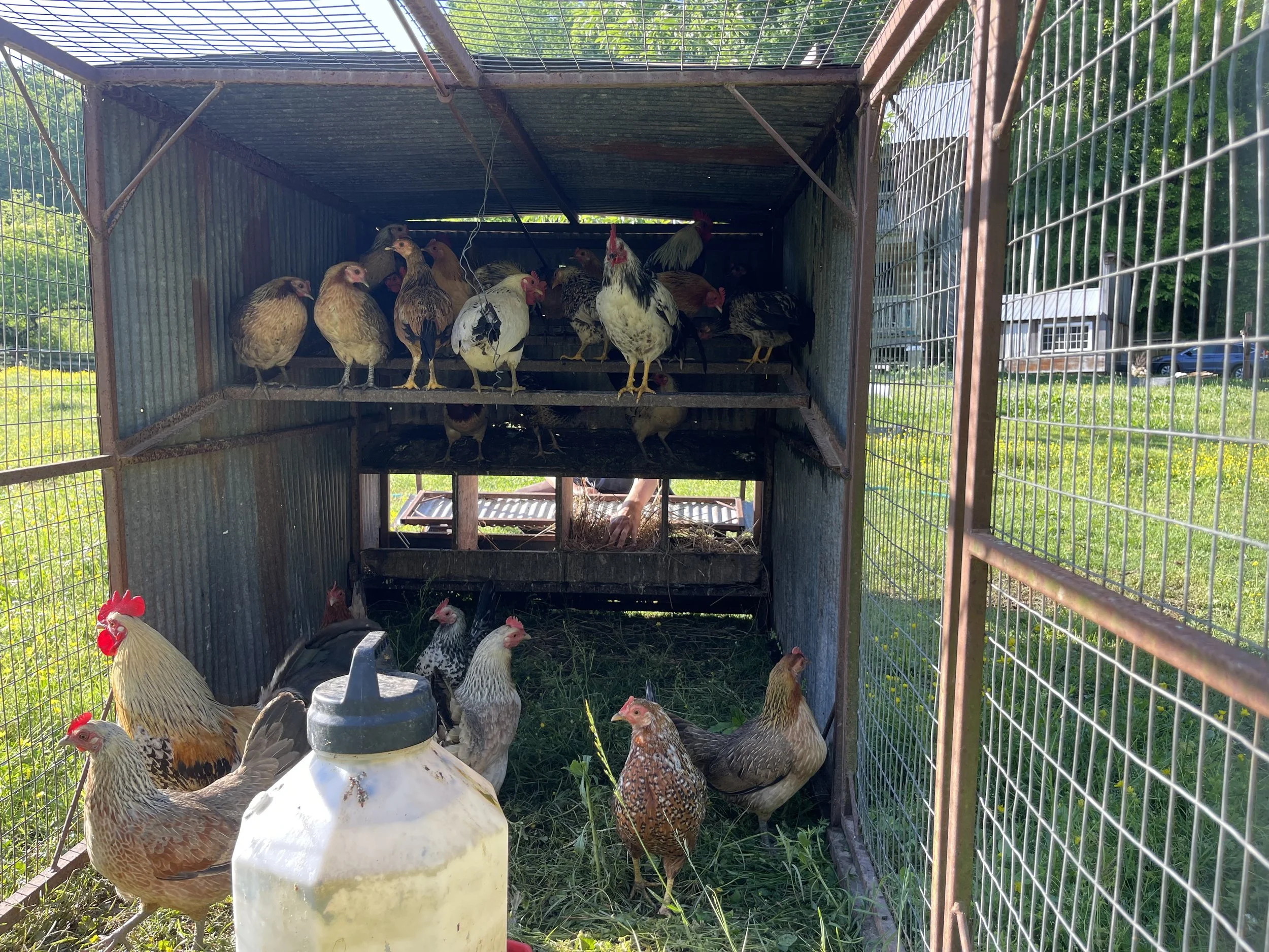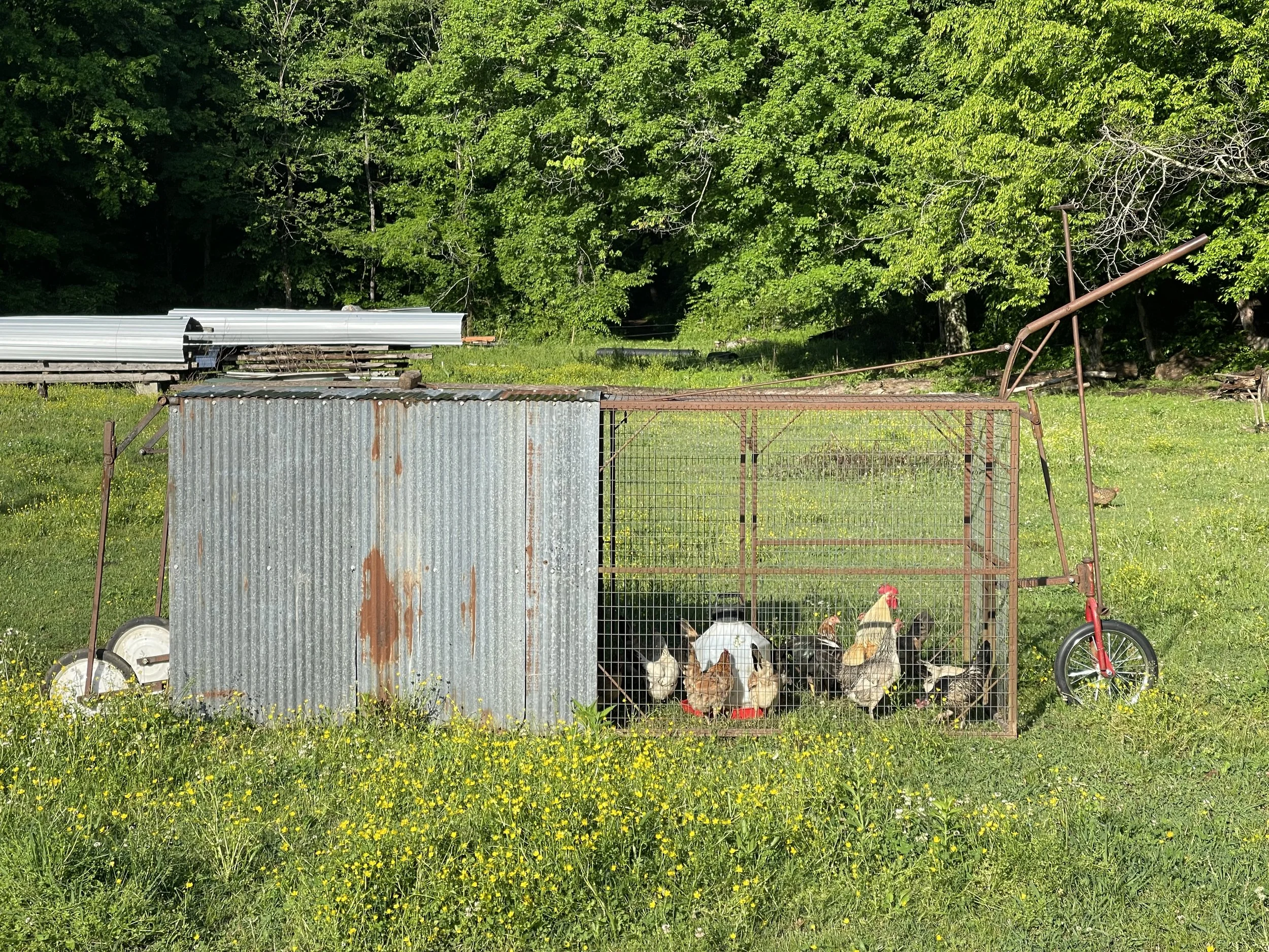 Our flock of banty-chickens had been free-ranging all winter (boy did they make a mess in the tool shed!), and in order to keep them from tearing up our small raised-bed garden, I had to get some things fixed on the steel chicken tractor I built a number of years ago. The chicken tractor was a cool concept- it lifts off the ground on it’s wheels a few inches for moving via the throw of a lever. Unfortunately, chicken manure is VERY corrosive to the steel tubing I framed it with. After some repairs though, I’m confident it is good to go for a few years yet. We’ve got most of the chickens penned up now, with the exception of a handful of broody hens who have little chicks, or are still setting on eggs in hidden nests scattered around the place. Atlanta and I both grew up with chickens- and these bantams are some of the most prolific setters we’ve seen.