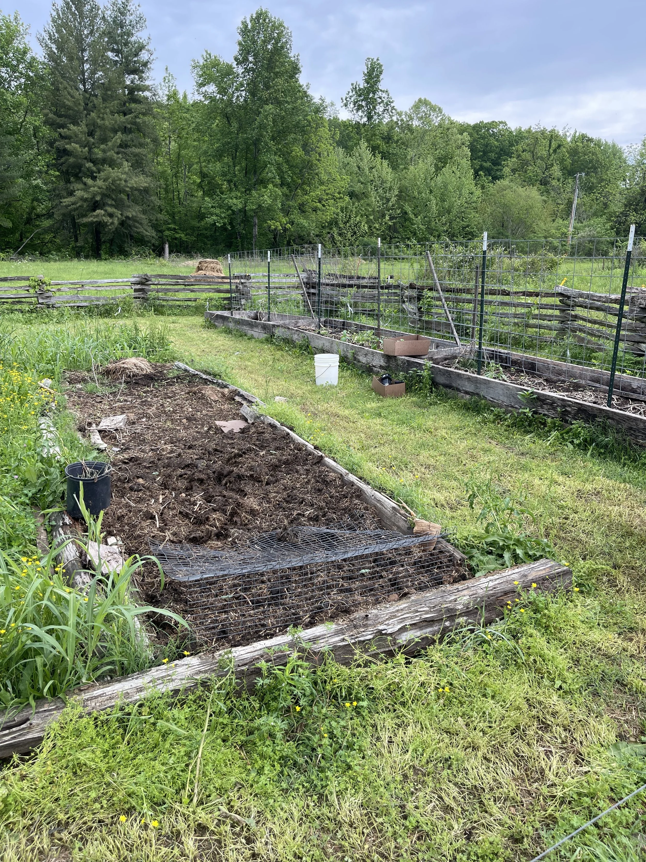 Atlanta is putting in a very small garden this year, focusing on a couple of raised beds, which she’s taking her time with due to baby Robert’s arrival in mid-February. In the raised beds, she’s putting a handful of tomatoes and peppers a few sweet potatoes, some okra, some herbs and flowers, and a few other vegetables later. The kids are helping refill the raised beds with composted hay and cow manure from where the cows are fed their hay in the winter.
